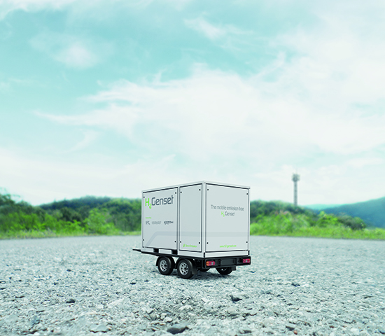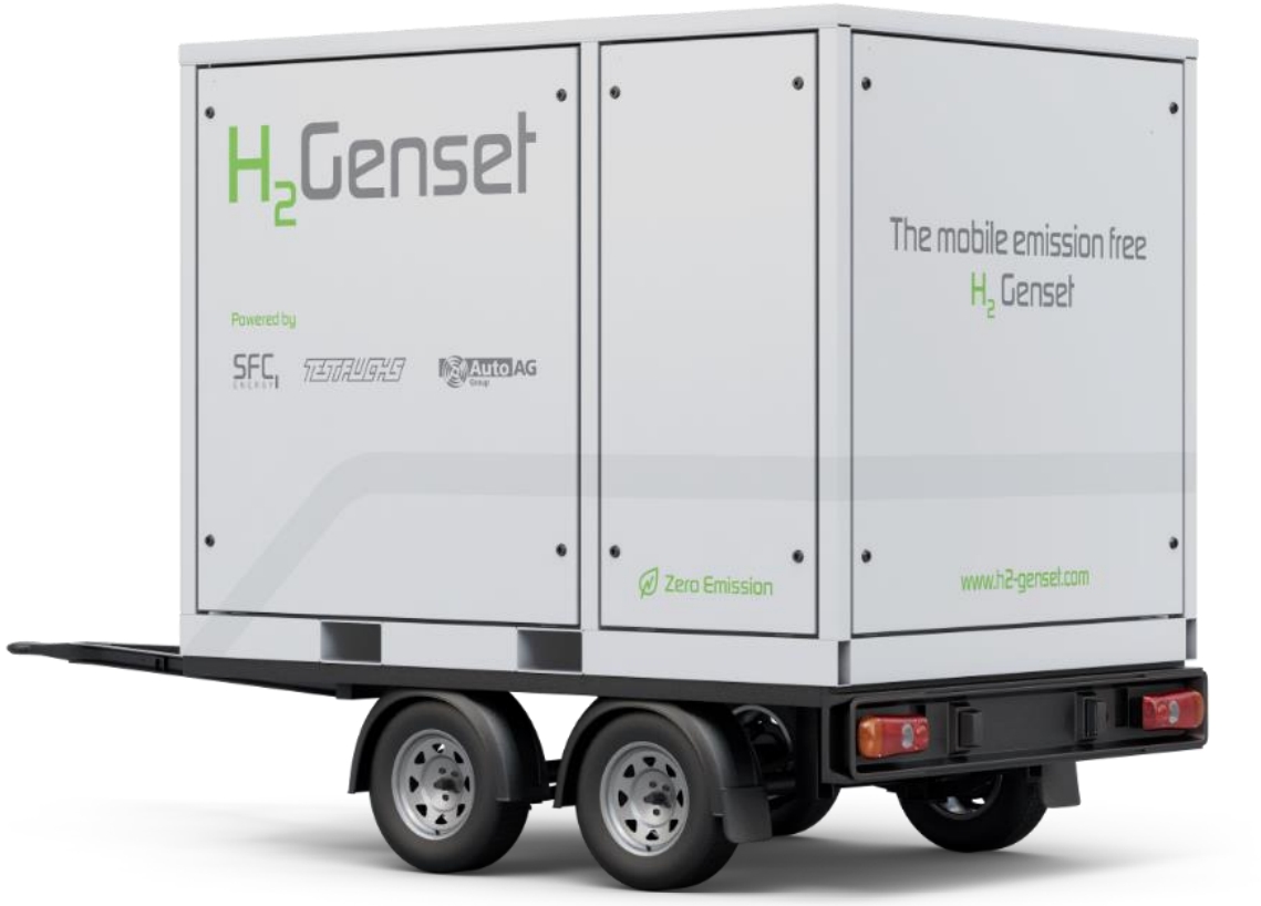 Das H2Genset ist ein mobiler Stromgenerator, der mit Wasserstoff (H2) betrieben wird. Er arbeitet "grün", emissionsfrei und geräuschlos, kann an einer gewöhnlichen Wasserstoff-Tankstelle betankt werden und wird sowohl in der Dauer-Stromversorgung als auch für die Not-Stromversorgung eingesetzt.